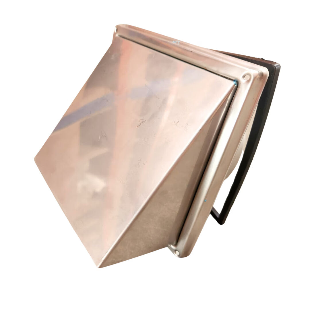 Stainless steel weatherproof cowl including backdraught flap & Mesh for wall mounted applications. A stylish option for modern design & architecture. Available with mesh - no flap also.